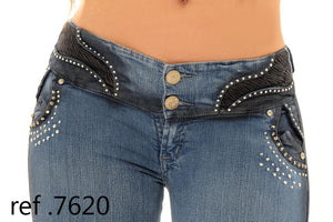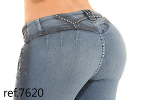 Este jean casual ofrece un estilo diferente con perlitas en el área de la cintura y un tono más oscuro en el costado lateral de la pierna dándole un a forma hermosa a tus piernas. Este diseño es 100% colombiano.