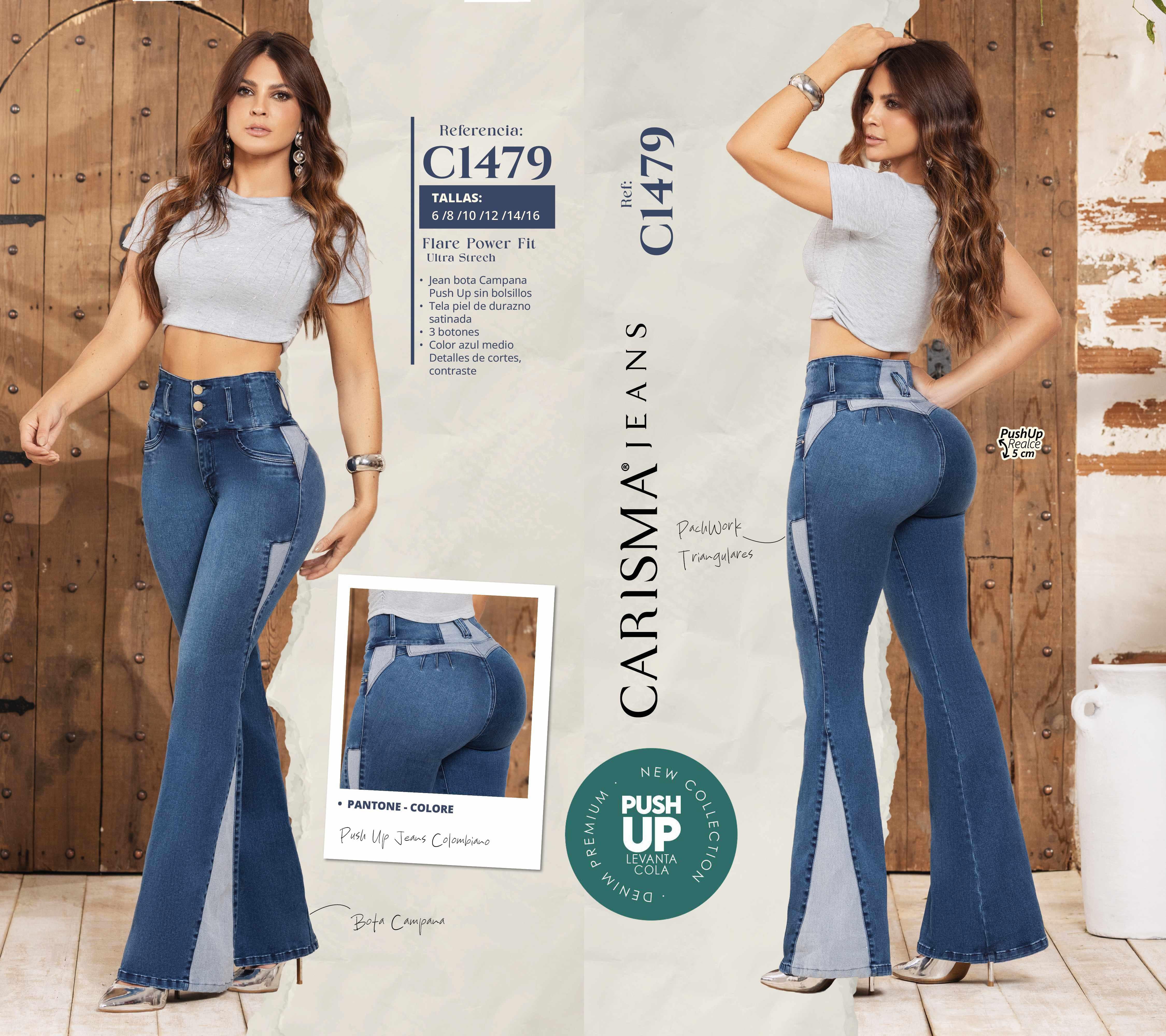 El Jean Colombiano Ref. C1479 de Carisma Jeans combina diseño innovador con el auténtico efecto moldeador de la moda colombiana. Su corte Flare Power Fit Push Up estiliza las piernas y define la silueta, mientras su pretina alta con tres botones aporta control y comodidad en el abdomen.