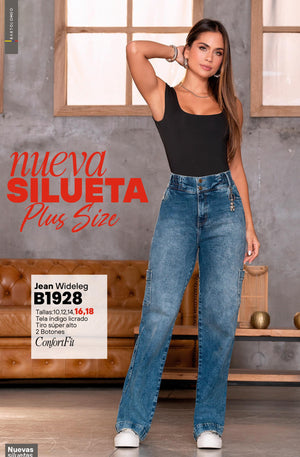 Este jean está diseñado para brindar comodidad y estilo a mujeres con curvas. Su silueta wideleg estiliza la figura sin marcar, mientras que el tiro súper alto ofrece ajuste y soporte ideal. Los bolsillos laterales aportan un toque moderno y funcional, y el diseño en tela índigo licrada asegura libertad de movimiento y mejor adaptación al cuerpo.