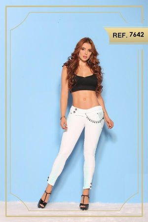 Precioso y elegante jean Levantacola de excelente calidad, 100% colombiano, fabricado con una tela suave y delicada que le da un estilo atractivo. Esta prenda cuenta con un gravado hermoso al costado de la pierna. Además tiene unos detalles preciosos en el área de la cintura, y un hermoso colgante que va por todo el costado del jean y le da un toque único y sofisticado.