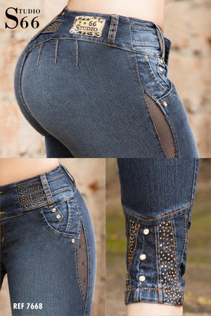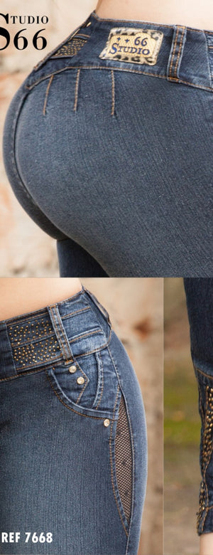 Luce radiante con este hermoso jean con acabados brillantes en el área de la bota, cintura y bolsillos delanteros. Esta hermosa prenda se ajusta a tus piernas dándoles un aspecto tonificado y perfecto. Luce siempre bella con esta prenda 100% colombiana.