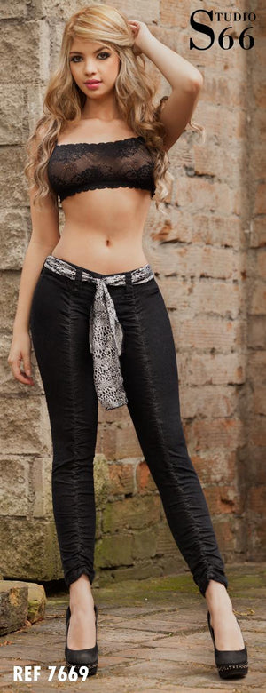 Beautiful jean of a unique and exclusive 100% Colombian design. This gorgeous jean is designed with a subtle tangle that goes from the feet to the waist and gives a fantastic shape and contour to your legs. Manufactured with excellent quality fabrics.