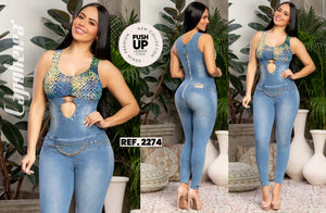 Enterizo levantacola marca Capoheira color azul con estampado floral en la parte superior delantera y con un detalle que permite ver la piel disponible en tallas 6,8,10,12,14