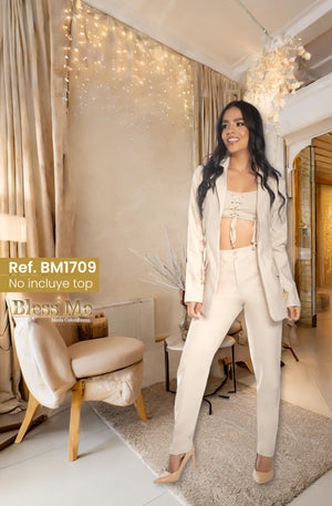 ¡Descubre la elegancia atemporal con nuestro conjunto en color beige de Bless Me! Esta marca colombiana te trae un conjunto de chaqueta y pantalón que encarna la sofisticación en cada detalle.