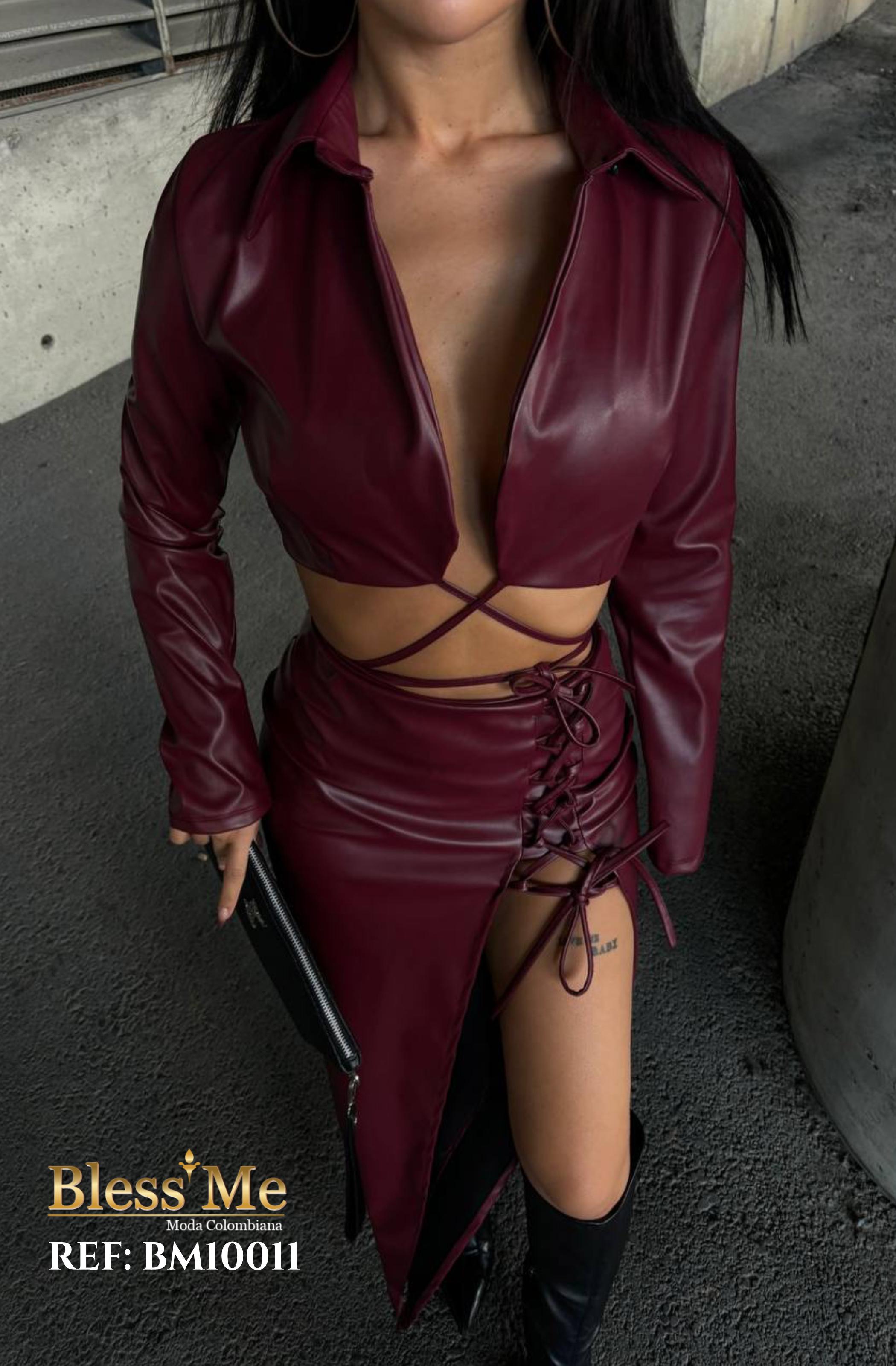 Conjunto de dos piezas en cuerina vino tinto – Diseño atrevido con toques urbanos